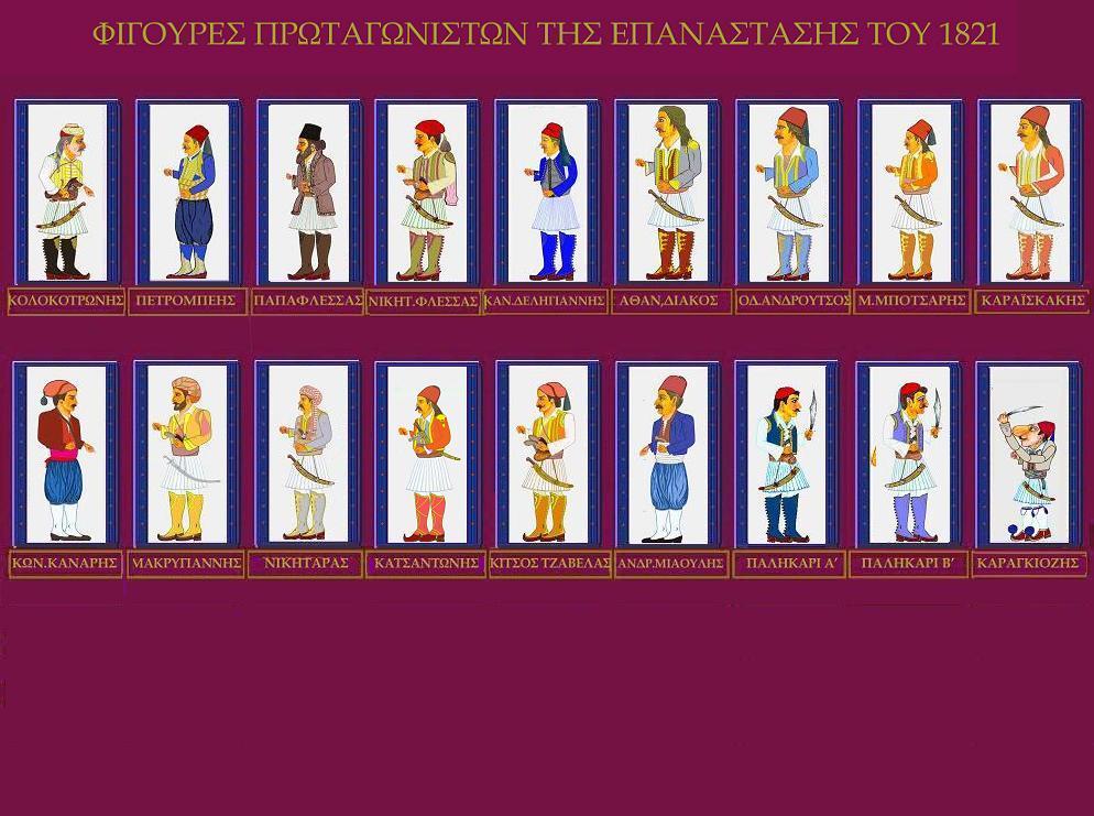 <<< Πατώντας κλικ στο όνομα κάποιου ήρωά μας, εμφανίζεται μεγαλύτερη φιγούρα ολόκληρη και ακόμη μεγαλύτερη σε κομμάτια. Στην συνέχεια μπορούμε να έχουμε την φιγούρα σε αρχείο PDF ή JPEG, πατώντας κλικ στην αντίστοιχη ένδειξη. Τυπώνουμε σε διάφανο χαρτί (ριζόχαρτο) όσο πιο χονδρό δέχεται ο εκτυπωτής μας. Βέβαια, για να φτιάξουμε φιγούρες λειτουργικές, χρειαζόμαστε χαρτί 200-220 γραμ. και εκτυπωτή κάπου θα βρούμε. Τυπώνουμε την ίδια φιγούρα δύο φορές (μία κατοπτρική) σε σχήμα Α4 για μικρές φιγούρες ή σε Α3 για μεγαλύτερες. Απλώνουμε κόλλα στην πίσω πλευρά της μιας εκτύπωσης και την κολλάμε στην πίσω πλευρά της άλλης ελέγχοντας μπροστά από ένα φως τις συμπτώσεις. Κόβουμε μετά με ψαλίδι τα κομμάτια και τα ενώνουμε με σερνικοθήλυκα υποδηματοποιών, αφού κάνουμε τρύπες, και η φιγούρα είναι έτοιμη. <<<