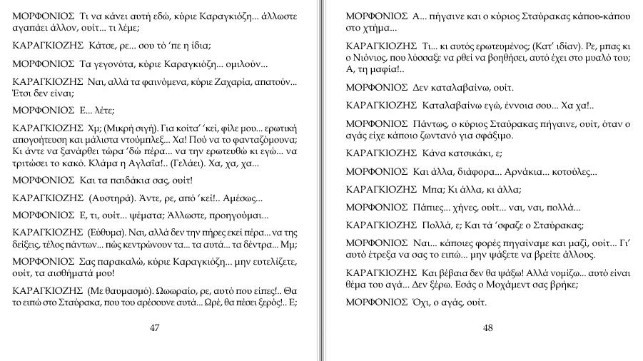 ΜΟΡΦΟΝΙΟΣ Τα γεγονότα, κύριε Καραγκιόζη... ομιλούν... ΚΑΡΑΓΚΙΟΖΗΣ Ναι, αλλά τα φαινόμενα, κύριε Ζαχαρία, απατούν...