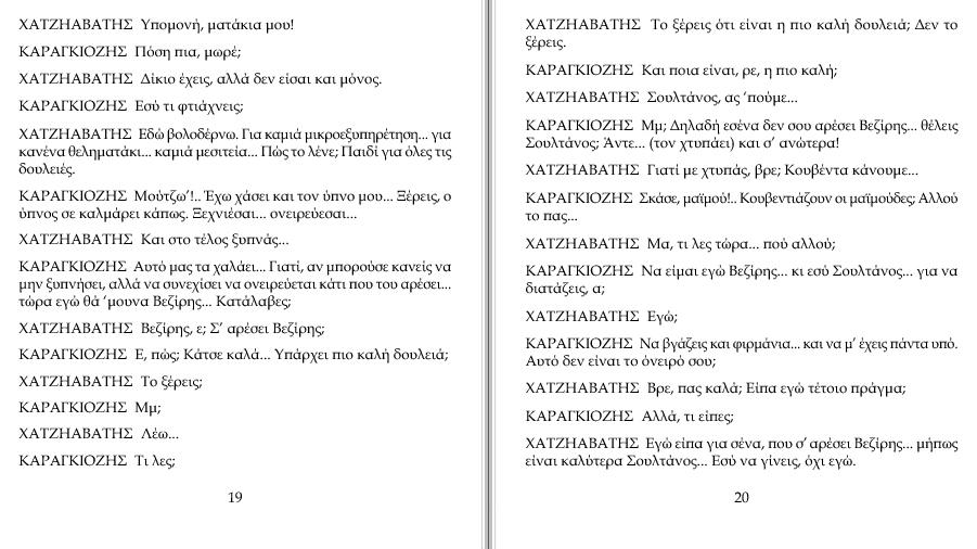 ΧΑΤΖΗΑΒΑΤΗΣ Γιατί με χτυπάς, βρε; Κουβέντα κάνουμε... ΚΑΡΑΓΚΙΟΖΗΣ Σκάσε, μαϊμού!.. Κουβεντιάζουν οι μαϊμούδες; Αλλού το πας...