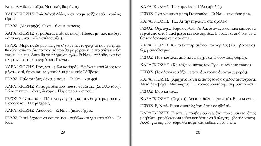 ΓΕΡΟΣ (Με έκρηξη). Ουφ!... Θα με σκάσεις... ΚΑΡΑΓΚΙΟΖΗΣ (Τραβιέται αμέσως πίσω). Πίσω... μη μας πετύχει κάνα κομμάτι!..