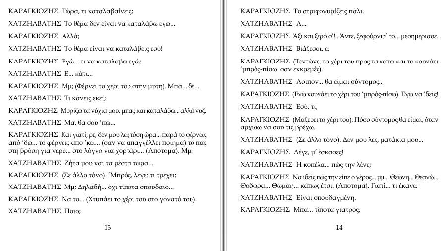 ΚΑΡΑΓΚΙΟΖΗΣ Να ιδείς πως την είπε ο γέρος... μμ... Θεώνη... Θεανώ... Θοδώρα... Θωμαή... κάπως έτσι. (Απότομα). Γιατί... τι έκανε;