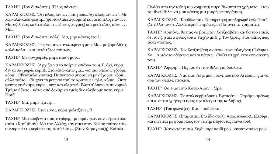 ΚΑΡΑΓΚΙΟΖΗΣ (Κορδώνεται). Εξυπηρέτηση με πληρωμή εγώ; Ποτέ!.. (Σε άλλο τόνο). Αλλά, αφού επιμένεις... (Παίρνει τα χρήματα).
