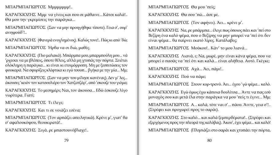 ΜΠΑΡΜΠΑΓΙΩΡΓΟΣ (Τον αρπάζει απειλητικά). Κρένε μ', γιατ' θα σ' αφαλουκόψου, θεουκιρατά!.. ΚΑΡΑΓΚΙΟΖΗΣ Σιγά, ρε μπαστουνόβλαχε!..