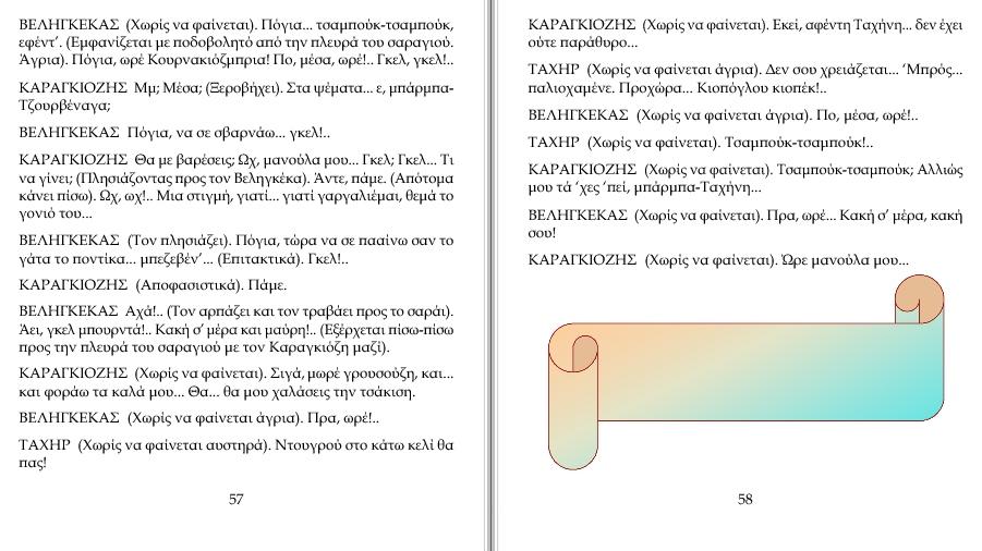 ΚΑΡΑΓΚΙΟΖΗΣ Σιγά, μωρέ γρουσούζη, και... και φοράω τα καλά μου... Θα... θα μου χαλάσεις την τσάκιση. ΒΕΛΗΓΚΕΚΑΣ Πρα, ωρέ!