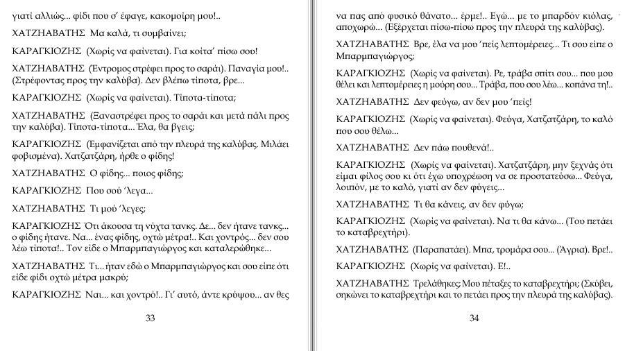 ΧΑΤΖΗΑΒΑΤΗΣ Τι... ήταν εδώ ο Μπαρμπαγιώργος και σου είπε ότι είδε φίδι οχτώ μέτρα μακρύ; ΚΑΡΑΓΚΙΟΖΗΣ Ναι... και χοντρό!..