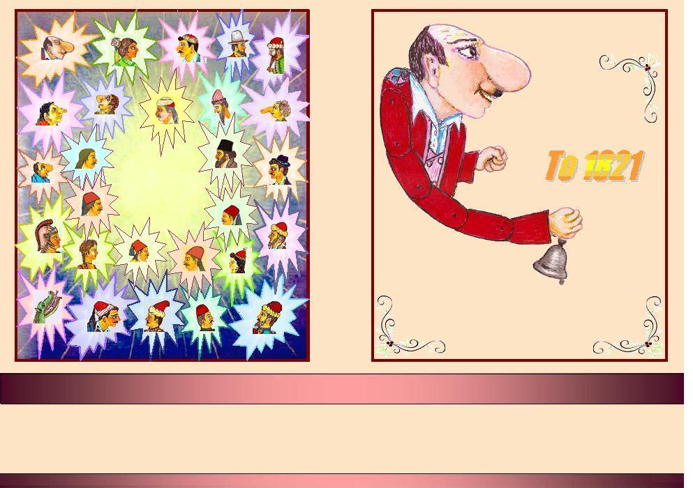 <<< Νέο έργο σε τρεις πράξεις και δέκα εννέα σκηνές φτιαγμένο ειδικά για την επέτειο των διακοσίων χρόνων από την Ελληνική επανάσταση του 1821. Λαμβάνουν μέρος δέκα επτά πρόσωπα με τον Καραγκιόζη σε ένα ρόλο όνειρο... Για την παρουσίαση του έργου είναι απαραίτητος τουλάχιστον ένας βοηθός, ενώ ένας άλλος τίτλος που θα του ταίριαζε είναι «ο Καραγκιόζης και η Ελληνική επανάσταση του 1821». <<<